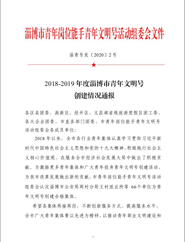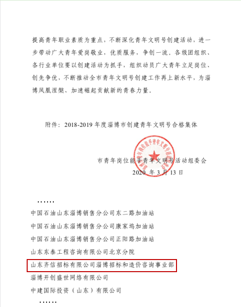 近日,共青團(tuán)淄博市委下發(fā)《2018-2019年度淄博市青年文明號(hào)創(chuàng)建情況通報(bào)》(淄青號(hào)發(fā)【2020】2號(hào)),山東齊信招標(biāo)有限公司淄博招標(biāo)采購(gòu)與造價(jià)咨詢(xún)事業(yè)部榮獲淄博市“青年文明號(hào)”榮譽(yù)稱(chēng)號(hào)。