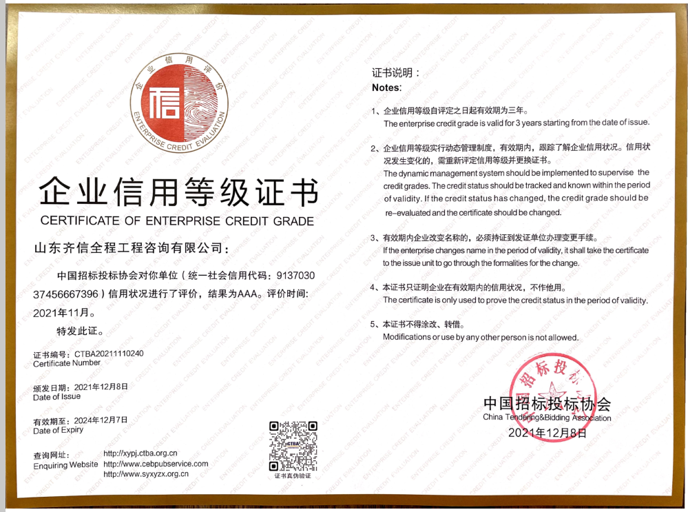 2021年12月,中國招標(biāo)投標(biāo)協(xié)會發(fā)布《招標(biāo)代理機(jī)構(gòu)2021年信用評價結(jié)果公示名單》,齊信獲評2021年招標(biāo)代理機(jī)構(gòu)信用評價AAA級企業(yè)(最高等級)。