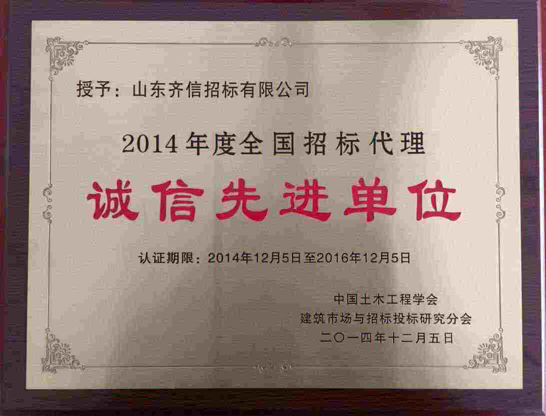 近日,在中國(guó)土木工程學(xué)會(huì)建筑市場(chǎng)與招投標(biāo)研究分會(huì)(以下簡(jiǎn)稱分會(huì))開展的“全國(guó)招標(biāo)代理誠(chéng)信先進(jìn)單位表彰活動(dòng)”中,山東齊信招標(biāo)有限公司被評(píng)為“2014年度全國(guó)招標(biāo)代理誠(chéng)信先進(jìn)單位”稱號(hào)。