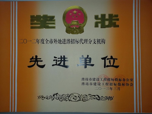 最近,在濰坊市建設(shè)工程招標(biāo)投標(biāo)協(xié)會(huì)組織的2012年度先進(jìn)單位和個(gè)人評(píng)選活動(dòng)中,我公司濰坊分公司榮獲“2012年度全市外地進(jìn)濰招標(biāo)代理分支機(jī)構(gòu)先進(jìn)單位”稱號(hào),高偉九同志被評(píng)為“2012年度全市招標(biāo)代理工作先進(jìn)個(gè)人”。這是濰坊市建設(shè)工程招標(biāo)投標(biāo)辦公室與建設(shè)工程招標(biāo)投標(biāo)協(xié)會(huì)根據(jù)2012年度招標(biāo)代理機(jī)構(gòu)定期考核結(jié)果和實(shí)際工作情況評(píng)選的,全市共評(píng)出8家單位為外地進(jìn)濰招標(biāo)先進(jìn)分支機(jī)構(gòu)。