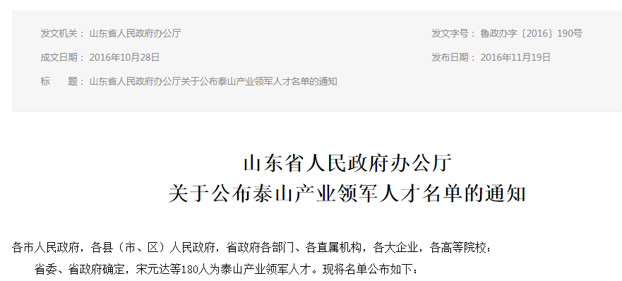 9. 10月底,經過組織動員、初步評選、專家評審、現場考察、公示公告等嚴格程序,公司申報投資建設項目綜合服務產業鏈項目成功入選“2016年度泰山產業領軍人才工程”,董事長郭培勛入選“泰山產業領軍人才”。