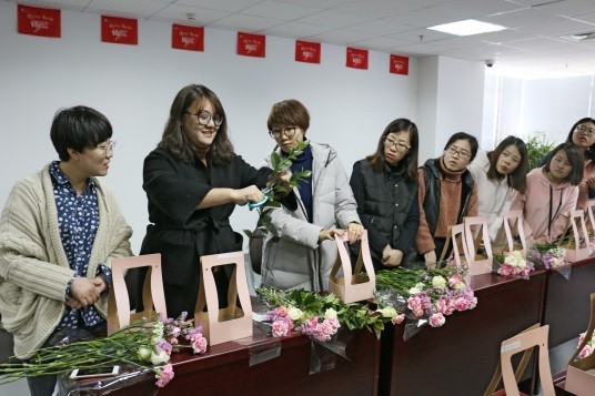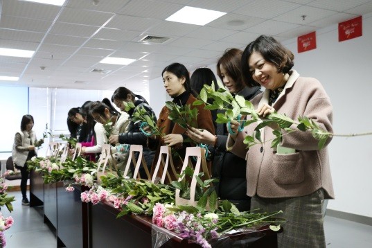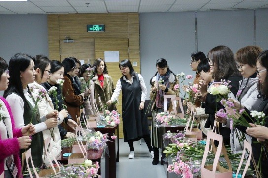 活動中,女職工們積極參加。花藝培訓(xùn)老師首先對花藝?yán)碚撝R進(jìn)行了簡單介紹,包括插花的特點(diǎn),有時間性,生命性,時尚性,裝飾性等。