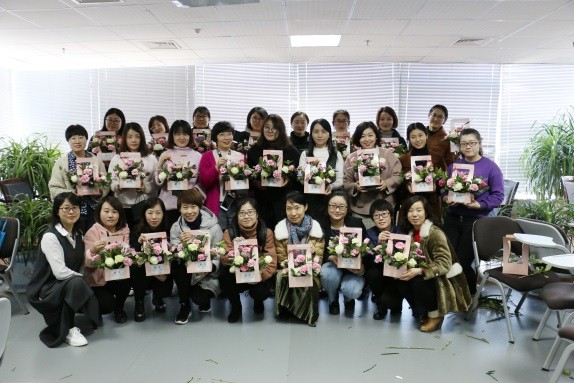 在短暫的介紹之后就是本次活動的高潮環(huán)節(jié),開始實(shí)踐插花。浪漫粉色的玫瑰,零星點(diǎn)點(diǎn)的滿天星,還有各色花卉放滿了桌子。大家插花時,講究色彩搭配,錯落有致,也有藝術(shù)感滿分的同事開始了與眾不同的藝術(shù)插花,同樣美麗別致。熱鬧的一個上午很快就過去了,活動圓滿地落下了帷幕。每位女同事都手捧鮮花,歡度佳節(jié)。