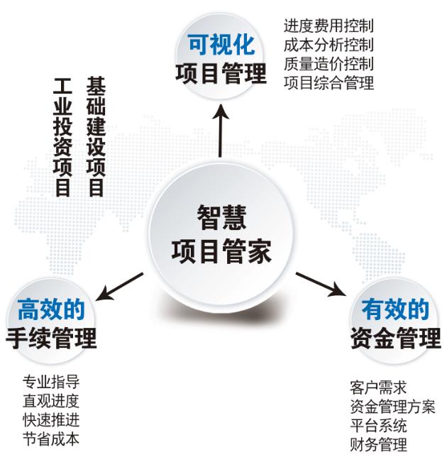 智慧項(xiàng)目管家服務(wù)平臺(tái)是結(jié)合項(xiàng)目建設(shè)中的各個(gè)痛點(diǎn),圍繞投資建設(shè)項(xiàng)目實(shí)施過程中投資、質(zhì)量、進(jìn)度、安全等多方面的問題,通過創(chuàng)新服務(wù)模式,集手續(xù)管理服務(wù)、項(xiàng)目建設(shè)管理、資金使用管理等功能為一體的可視化“大數(shù)據(jù)” 綜合服務(wù)平臺(tái)。