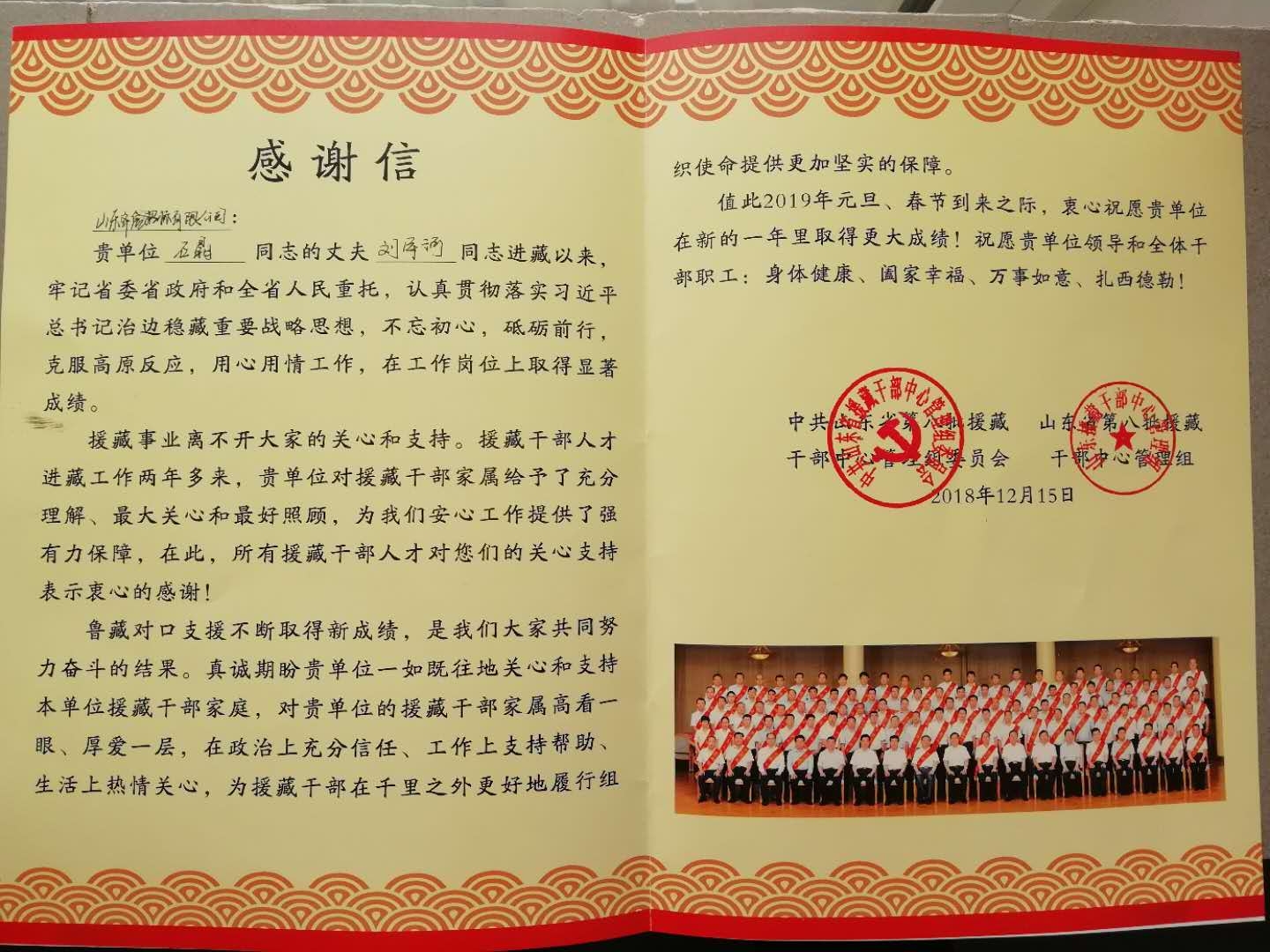 2019年元旦來臨之際,公司收到一封來自中共山東省第八批援藏干部中心管理組委員會的感謝信,信中對咨詢服務事業部經理石晶的丈夫劉軍河同志在魯藏對口支援工作中的辛勤付出給予高度評價與稱贊,對石晶及公司積極支持、關心援藏事業表達衷心的感謝,字里行間涌動著濃濃的情誼與祝福。